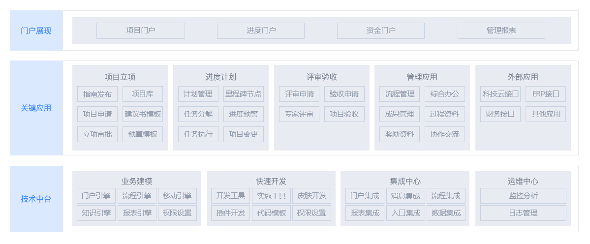 项目立项、审批、任务分解、项目执行、项目变更、项目统计分析、项目验收、项目考核、项目后评价、成果管理、电子归档等项目全程一体化
